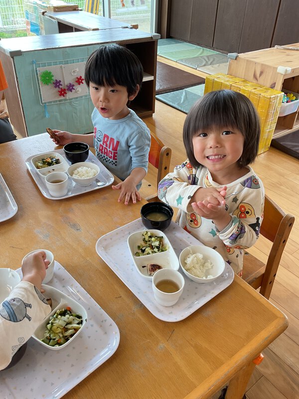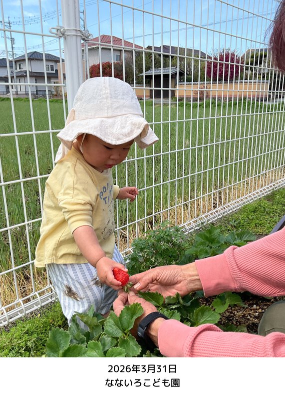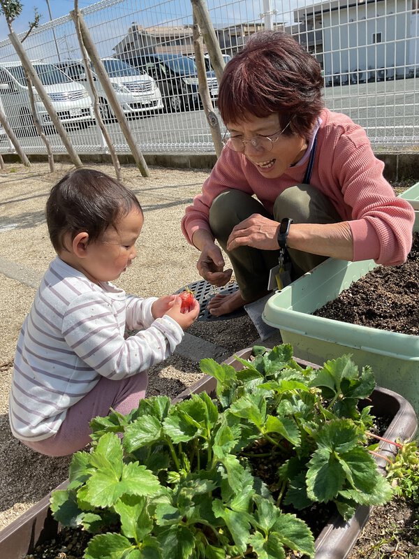 楽しみにしていたイチゴが赤くなりました。早速収穫しましたよ。「見て いちご」と嬉しそうに伝えに来てくれました。みんなで分けて食べましたよ。もっとたくさんなりますように😊