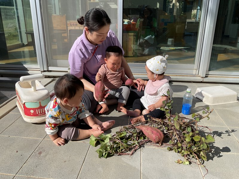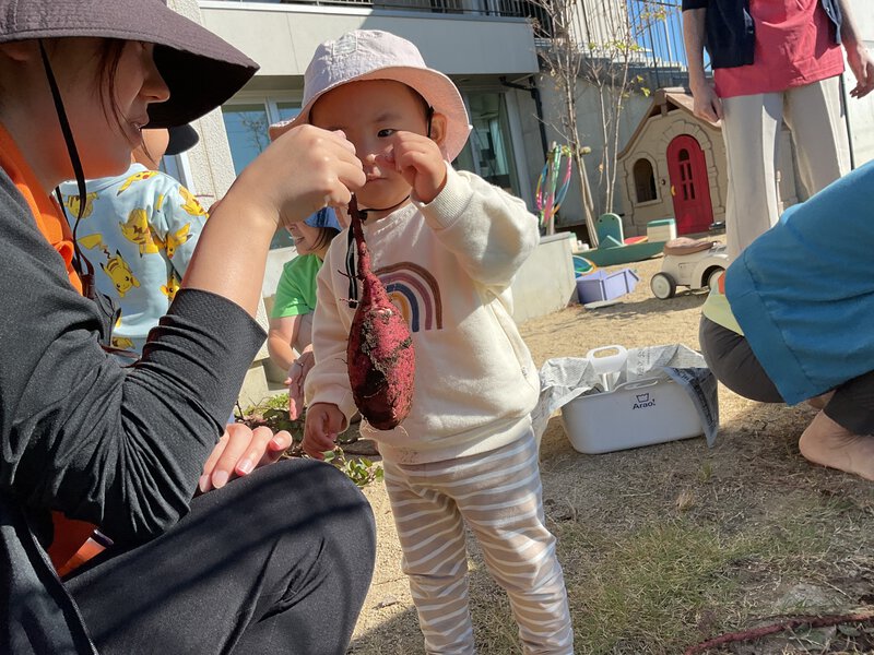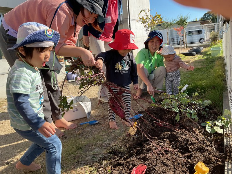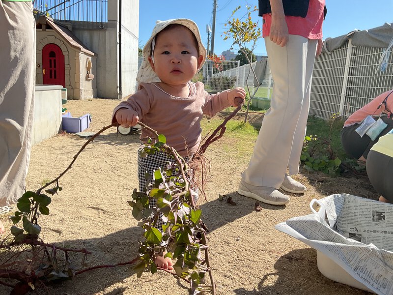 今日はお芋ほりを行いました!みんなでいものツルを引っ張り、「うんとこしょ、どっこいしょ、」とツルを引っ張った後は、土の中に埋まっている芋を探しました!大きいお芋を収穫することが出来ました✨収穫が終わったツルを持ってみたり、収穫したお芋を見たりするなど育てて収穫する喜びを感じることができましたよ♪