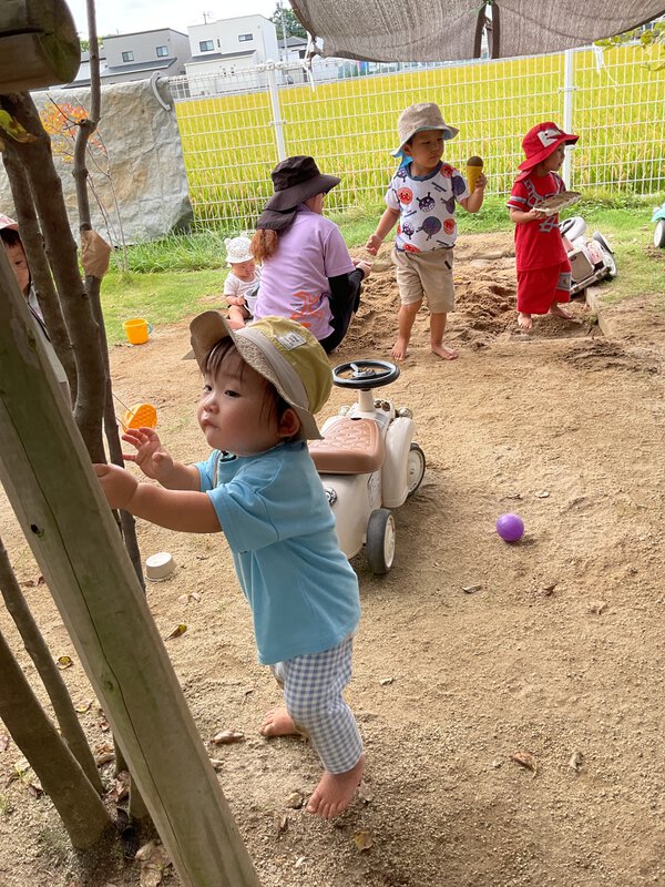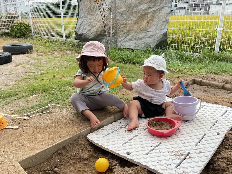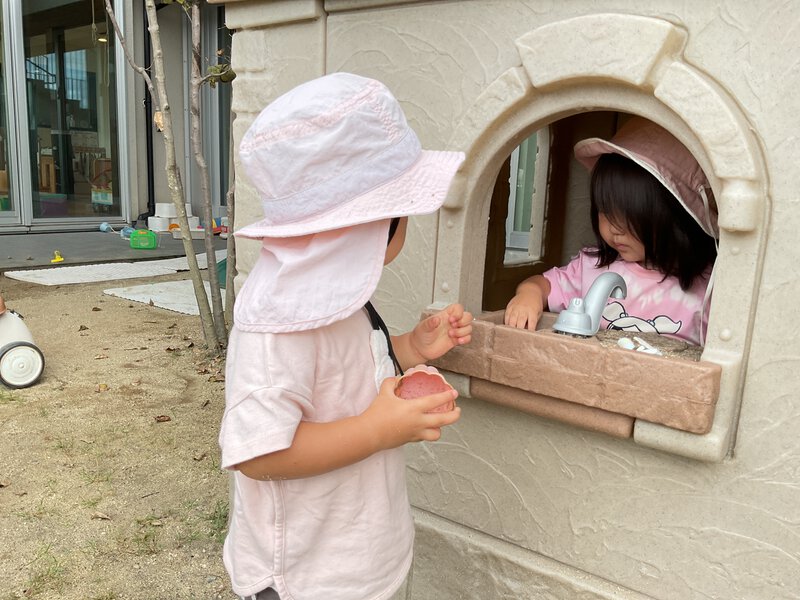 今日は30分間戸外遊びを行いました。お家でお店屋さんごっこをしていました。「いらっしゃいませー」「アイスどうぞ」とお友達に渡していました😊砂場では砂をバケツに入れて遊んだり、アイスクリームを保育者と一緒に作ったりしていました🍦