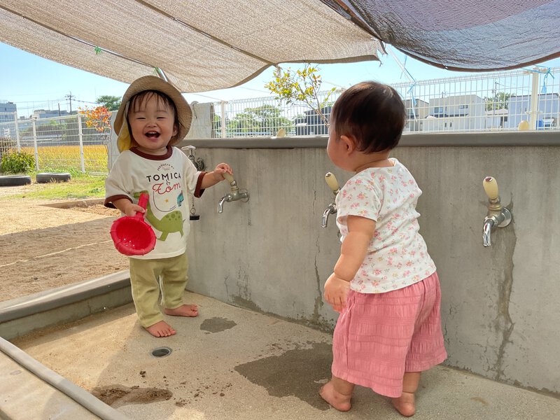 0歳児さんは保育園に残り、園庭遊びを行っています。お友だちとニコニコ笑い合ったり、お砂を触ってみるなどゆったりと過ごしました✨