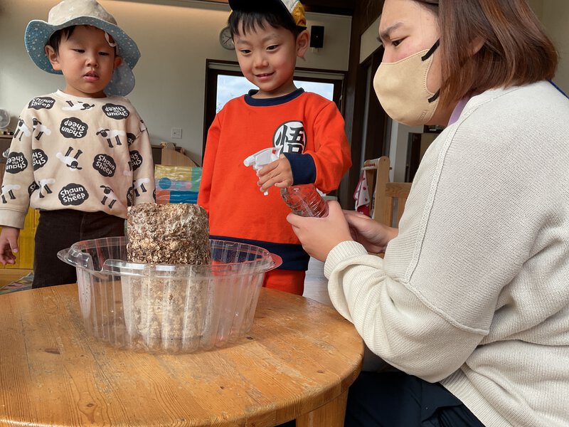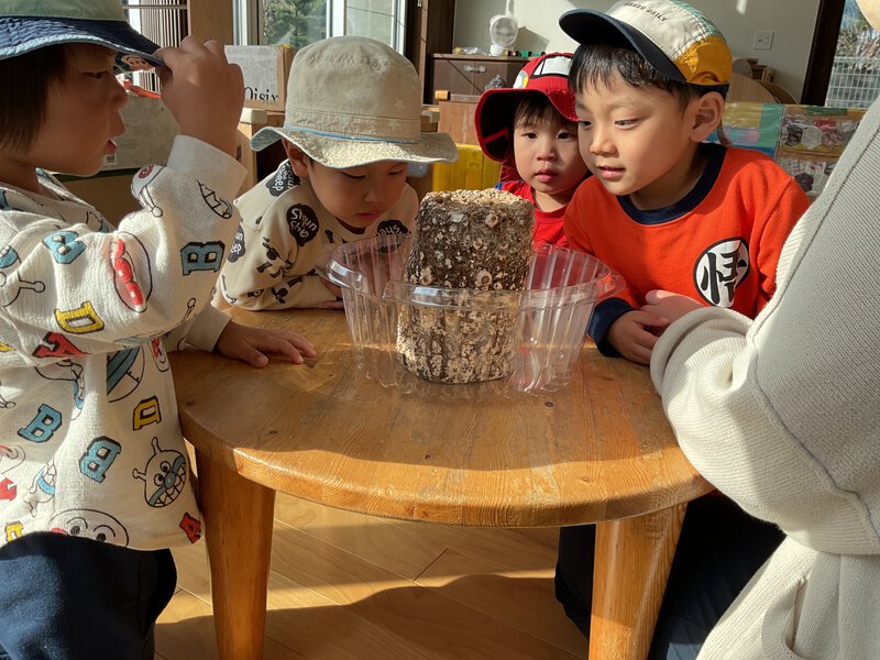 今日は栽培キットを2歳児さんと観察し、原木の匂いを嗅ぐとキノコ特有の匂いを感じていました。