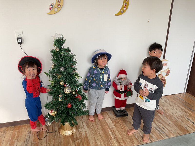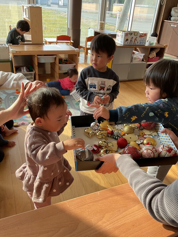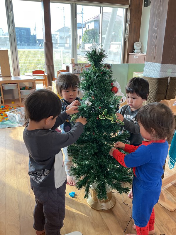 今日はクリスマスツリーの飾りつけを行いました!飾りつけの前に保育者が「サンタさんのいちねん」の絵本を読み、絵本の中に出てくるクリスマスツリーを見てから飾りつけをしました。たくさんオーナメントがあり「どれにしようかな」と悩みながらも自分の好きなオーナメントを取って飾っていました😊飾りつけが終わるとライトをつけて写真を撮りました📷