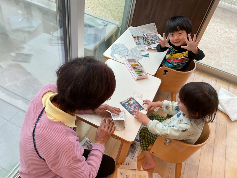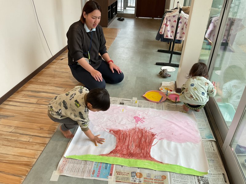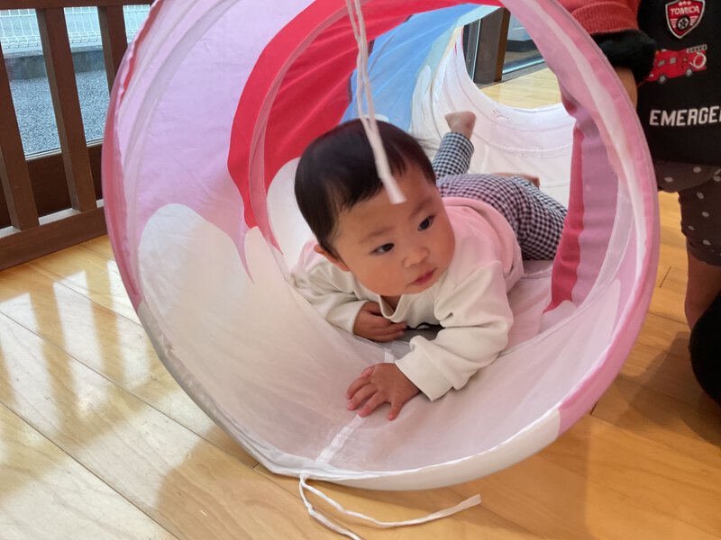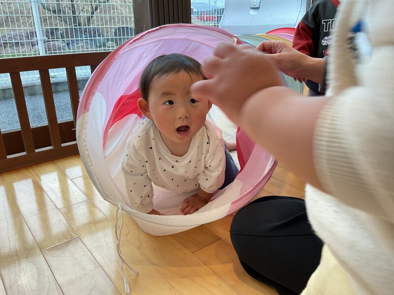 狭い空間が大好きなお友だち。トンネルの中に座り、その空間を楽しんでいましたよ。 もっと楽しめる様にテントを出してみました。早速なかに入り、「ばぁ」と窓から顔をだしたり、テントの中から外の車を見たりと楽しんでいましたよ。 お別れ会の準備も進んでいますよ。