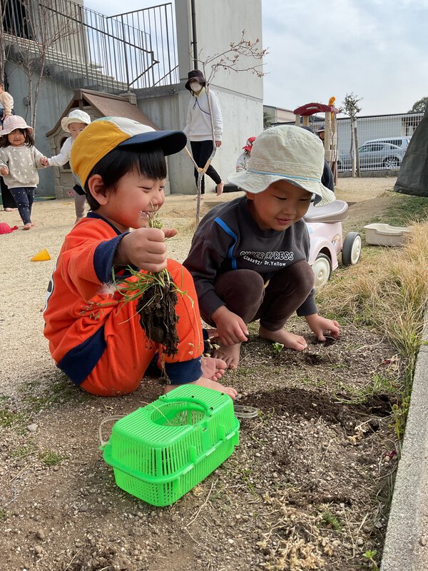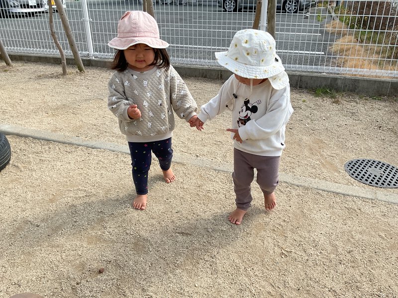 お外遊びではお友だちと一緒に虫探しをしたり、手を繋いで園庭をお散歩する姿も見られました😊