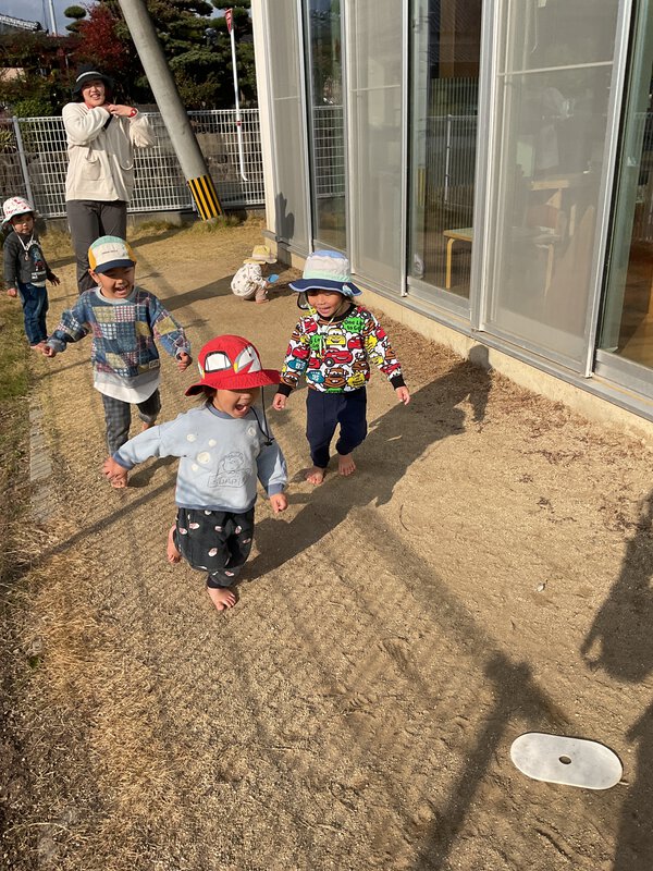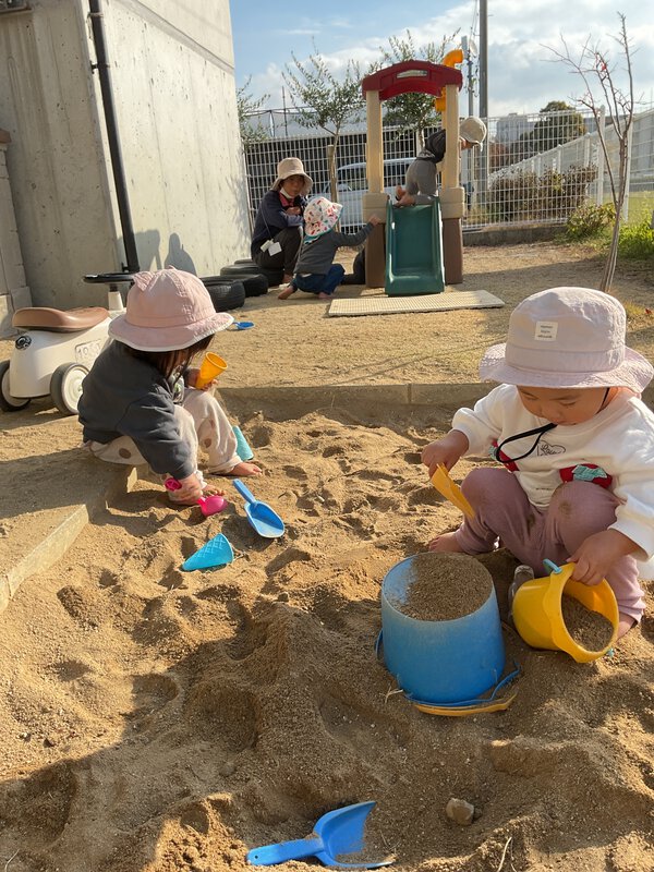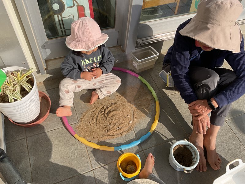 今日も少しひんやりとした風が吹いていましたね!子ども達は寒さに負けないよう、走って体を温める姿が見られましたよ♪ また今日は、砂場でアイス作りやバケツに砂を集めてるなど、サラサラの砂に触れて遊んでいました。サラサラの砂の為、カップの形に作ろうとしても、固まらなかったので、入れ物をジッと眺めて、「どうしてだろう?」という表情を浮かべていたのがとても可愛らしかったです😊