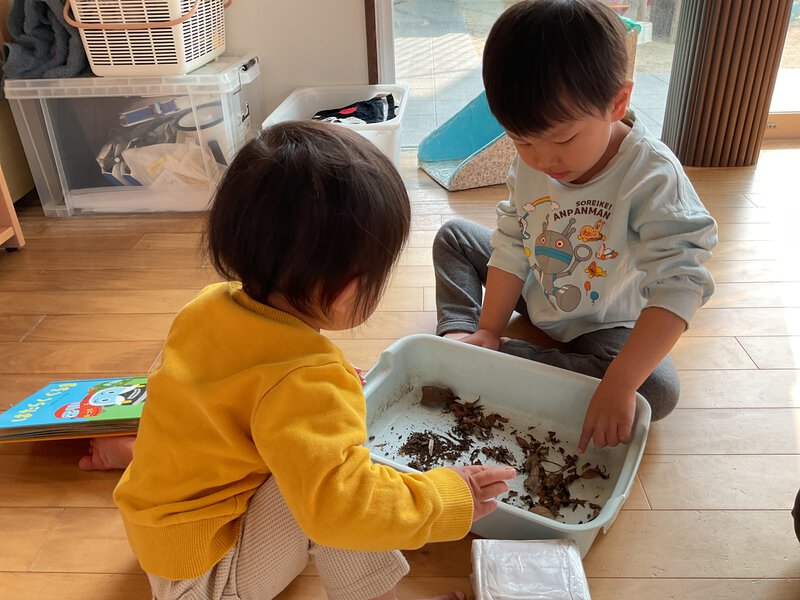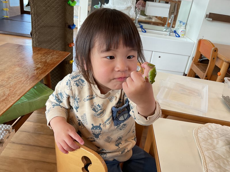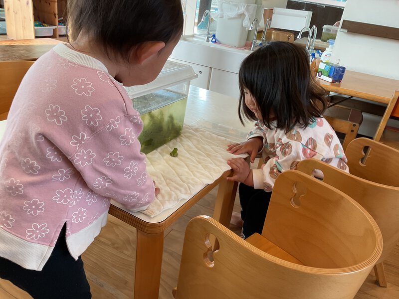 今日は保育者がお家から持って来たカエルやダンゴムシの観察を楽しんでいましたよ!久しぶりの生き物に子どもたちも嬉しそうに振れる様子が見られました♪