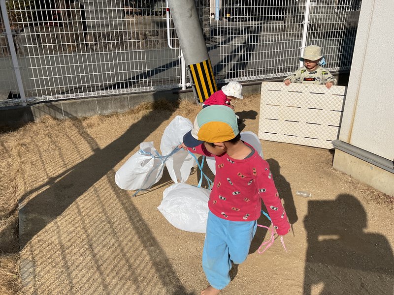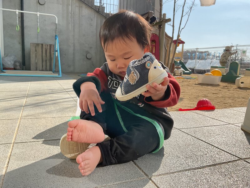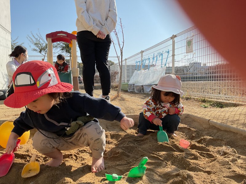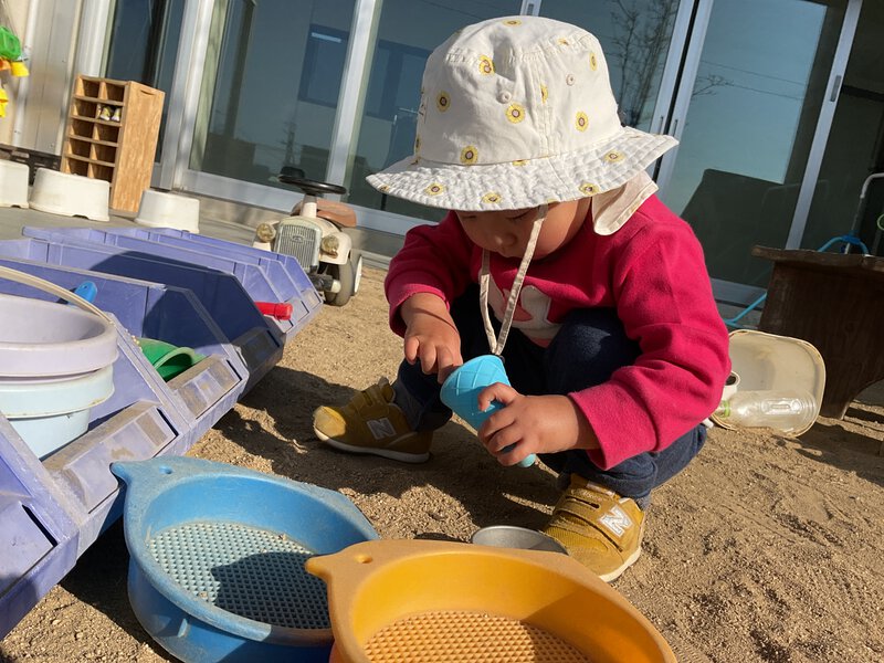 園庭では、スコップを砂に埋めて宝探しをしたり、石を集め、小さな穴に入れ、ぽっとん落としをしたりと、子どもたちにとってはスコップが宝物になったり、石がぽっとん落としの道具になったりと、自分たちで遊びを考えて遊んでいますよ。