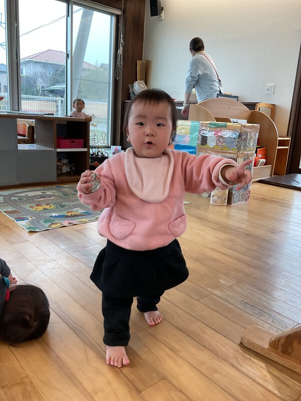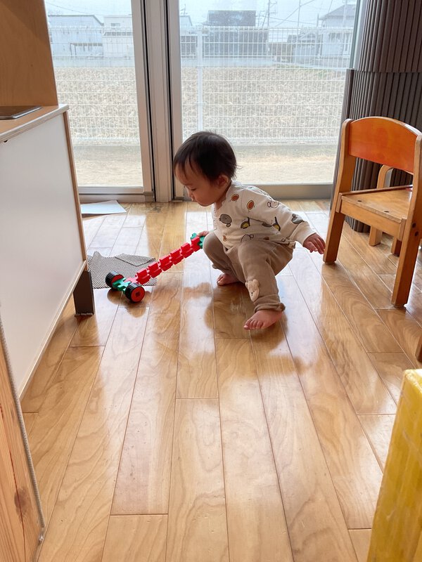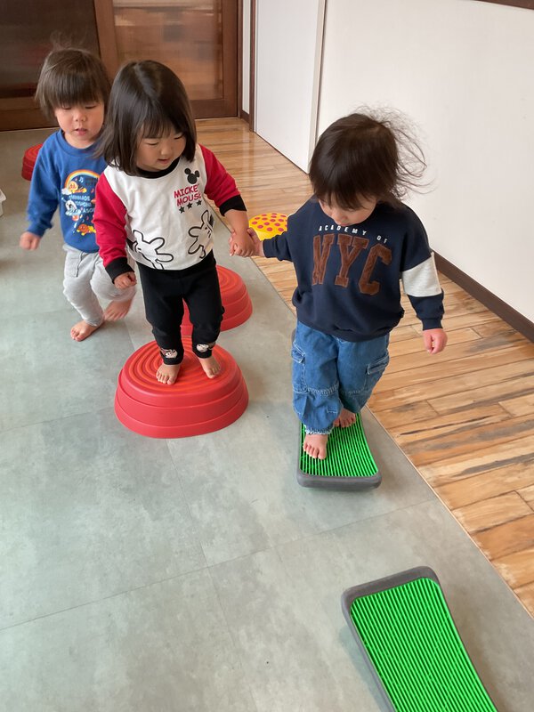 今日は廊下で飛び石ブロックとジャンプ台で遊びました!お友だちの手を取り一緒にバランスを取って進む異年齢の関わりが素敵でした✨ お部屋の中では、ブロックで掃除機を作り棚の下をお掃除する姿も。ピカピカにしようとしている気持ちが伝わってきましたよ。 また、この前の豆まきごっこの時に使用した豆を持って立つ姿も!この前の遊びを思い出していたのかもしれませんね♪