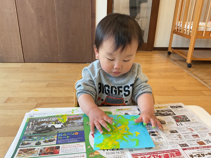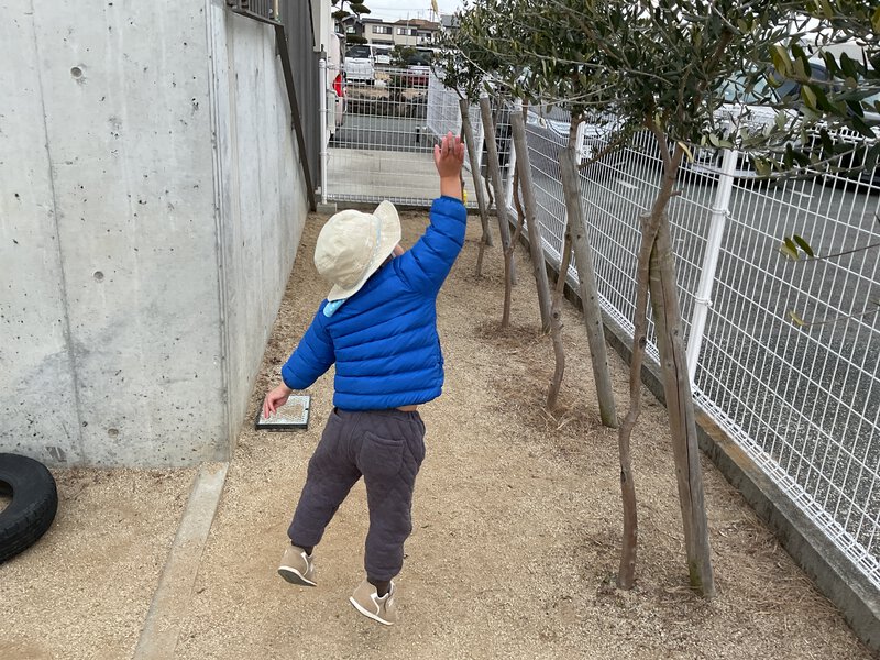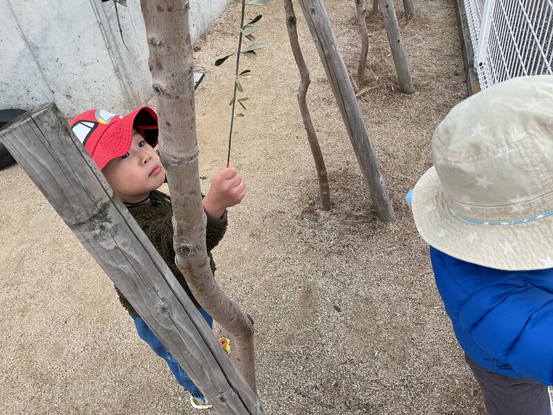 今日も寒かったですね💦寒さに負けないよう園庭で追いかけっこして体を温めましたよ♪体が温まった後は気に付いてる葉っぱをとろうと背伸びしたり、手に届く枝から葉っぱをとったり植物に興味を持って触れる姿が見られました!お部屋では0歳児さんが絵の具を使って製作遊びをしました✨