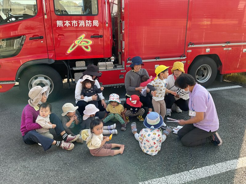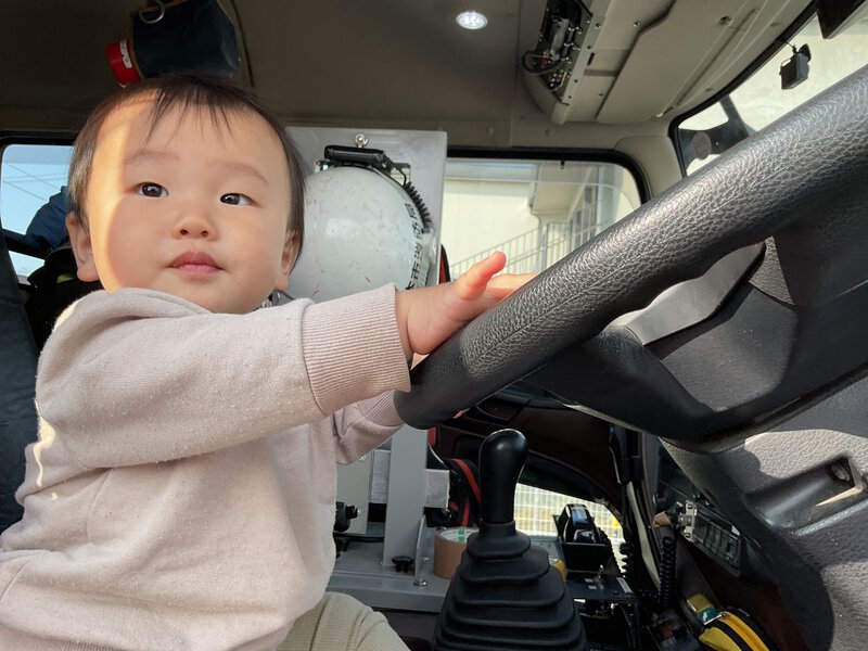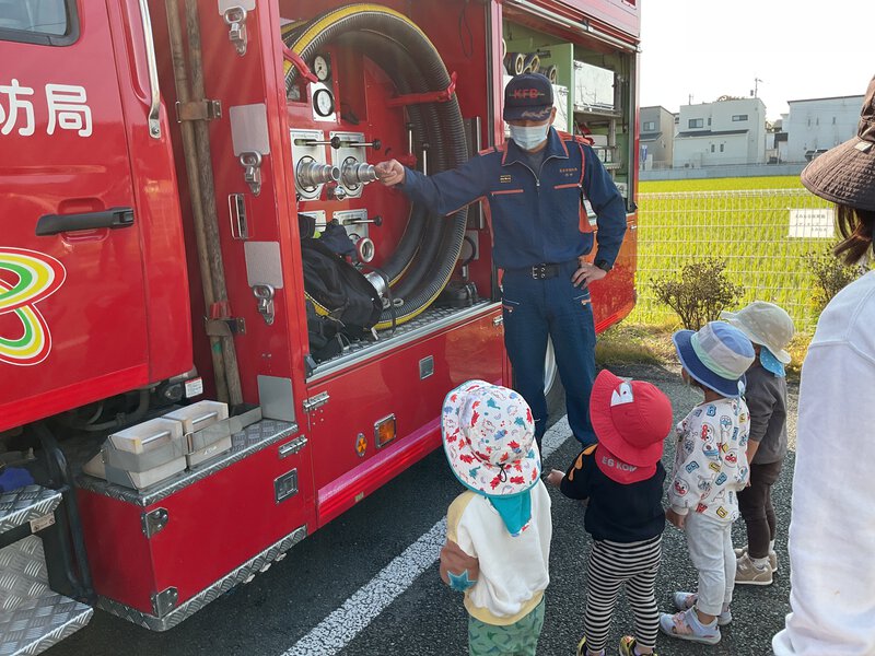 お話が終わった後には消防車の見学をさせてもらい、普段は見る機会のない装備品を見たり、運転席に乗せてもらうなどの体験をしましたよ♪