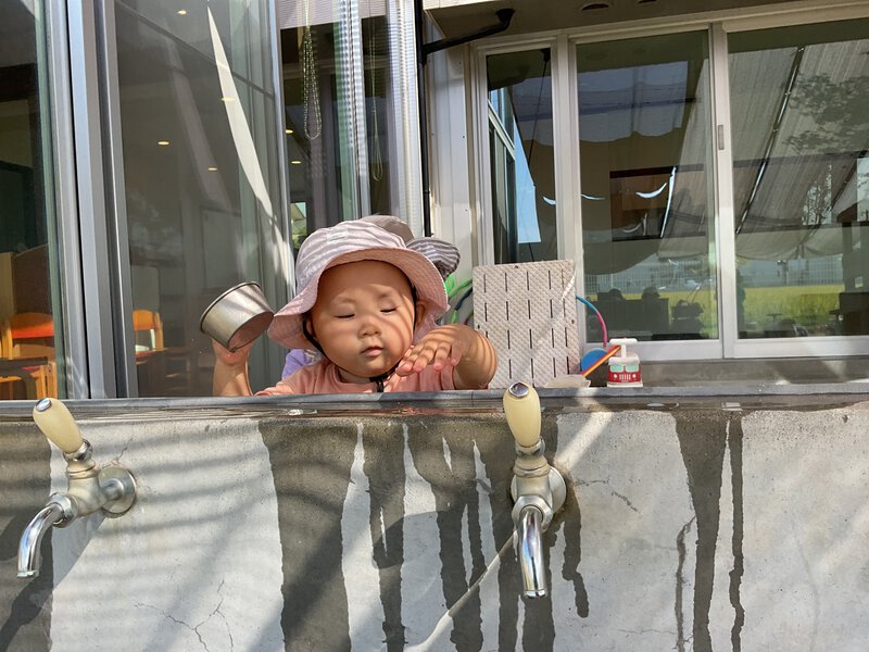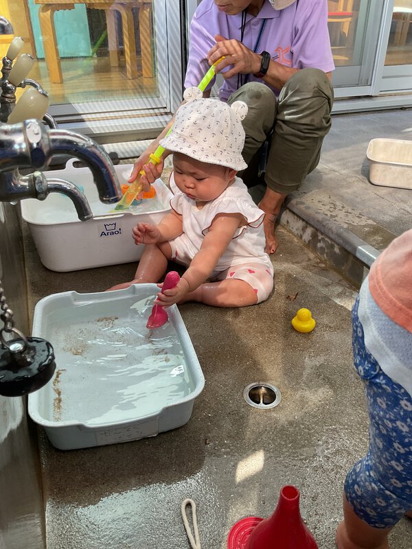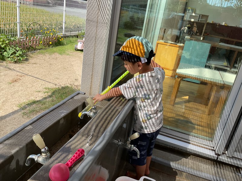 バケツに水を入れてスコップですくったり、水鉄砲をしたりしました。水に濡れると気持ちよさそうにしていました😊