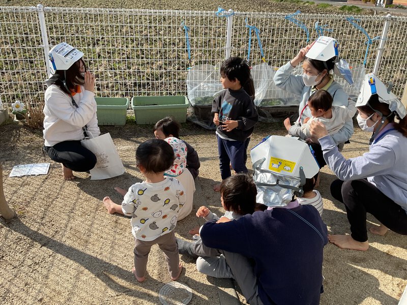 今日は災害避難訓練を地震からの火災を想定して行いました!「地震です!」の声に子ども達は保育者の元へ来て、ダンゴムシポーズをして頭を守り、地震がおさまった後に園庭に避難を行いました。だんだんと避難の方法も理解でき、口を押さえて避難する事が出来ました。