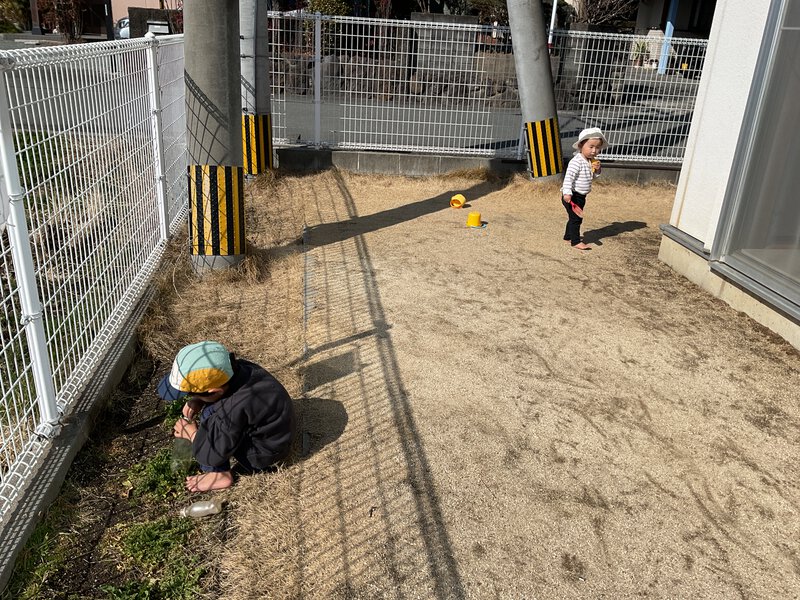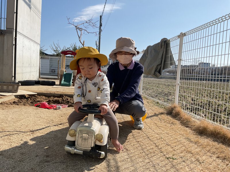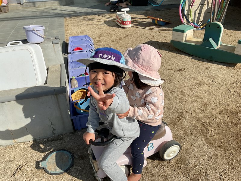 お外遊びでは、お友だちとコンビカーに相乗りしたり、先生に後ろから押してもらったりコンビカーに乗ってドライブを楽しんでいましたよ✨また、石集めが最近のブームなのか、石を集める姿も見られました♪