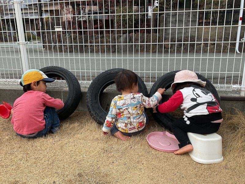 今日はお外でたくさん遊びました!お友だちがタイヤの中に水が入っているのを発見しました👀タイヤを斜めにしてスコップで水がすくえるようにしました。何しているのかなとお友だちもやってきて、お友だちの真似をしながらスコップで水をすくったり、手で水を触ったりしていました!