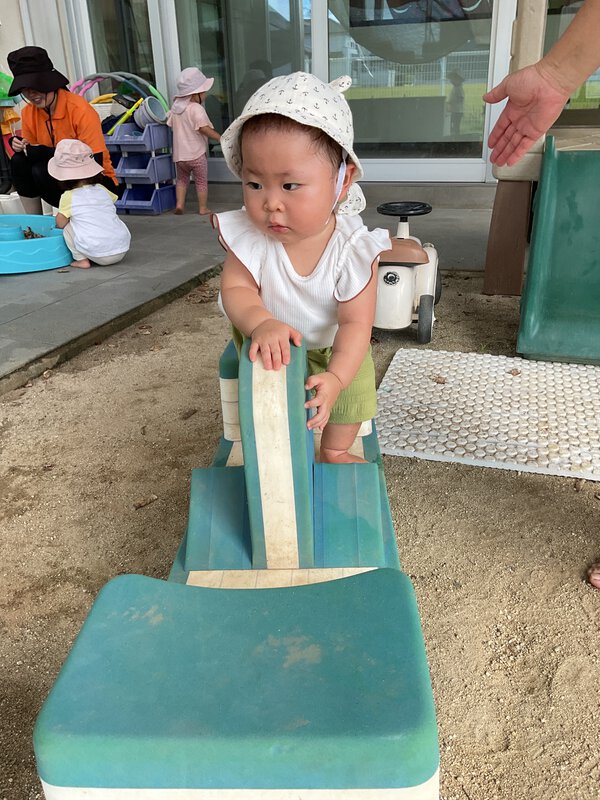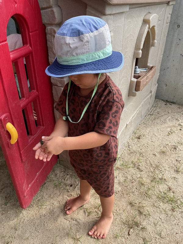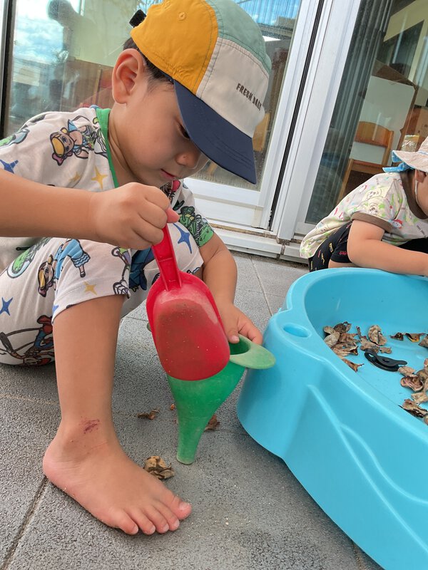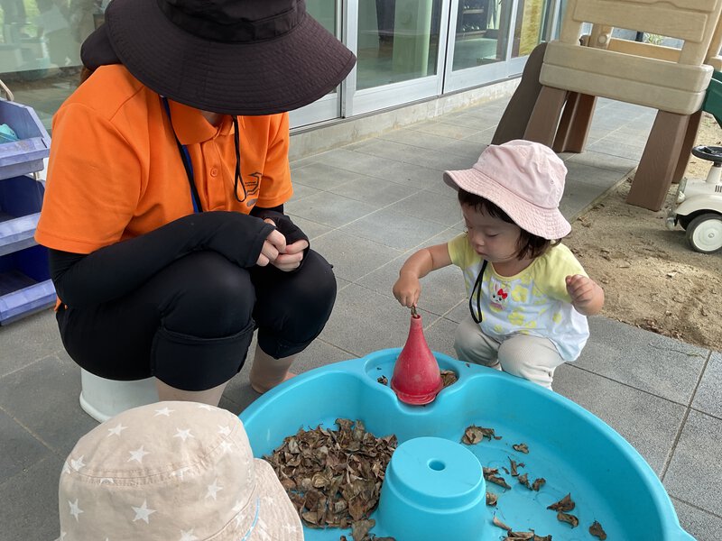 今日のお外遊びでは落ち葉をウォーターテーブルに入れて感触遊びを楽しみました!秋になり落ち葉も増えてきていますね🍂じょうごに葉っぱを入れてパリパリとした感触と音の変化を感じていました!また、シーソーを自分で揺らそうとしてみたり、カエルを自分で捕まえるなどできる事が増えてきている子ども達です!