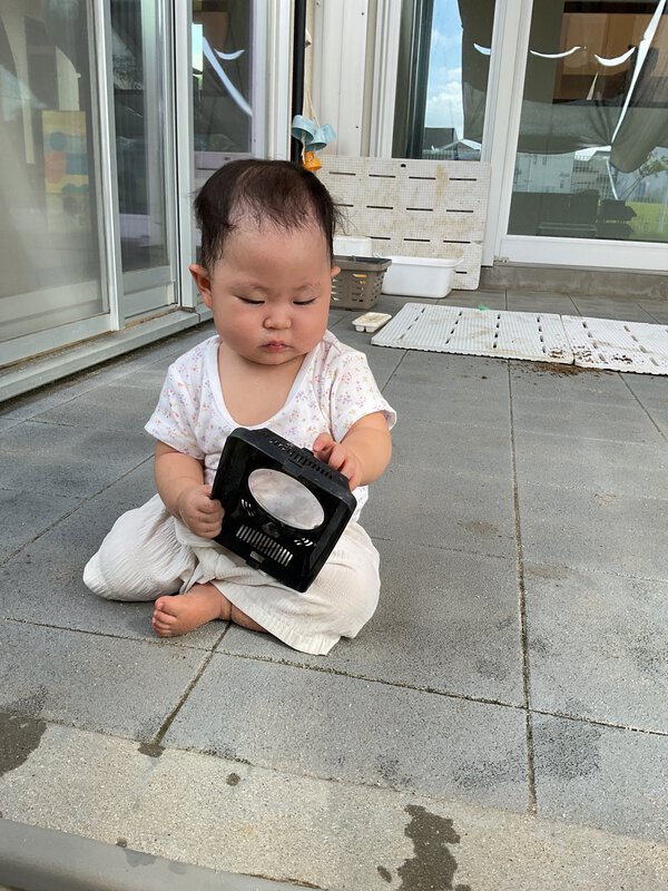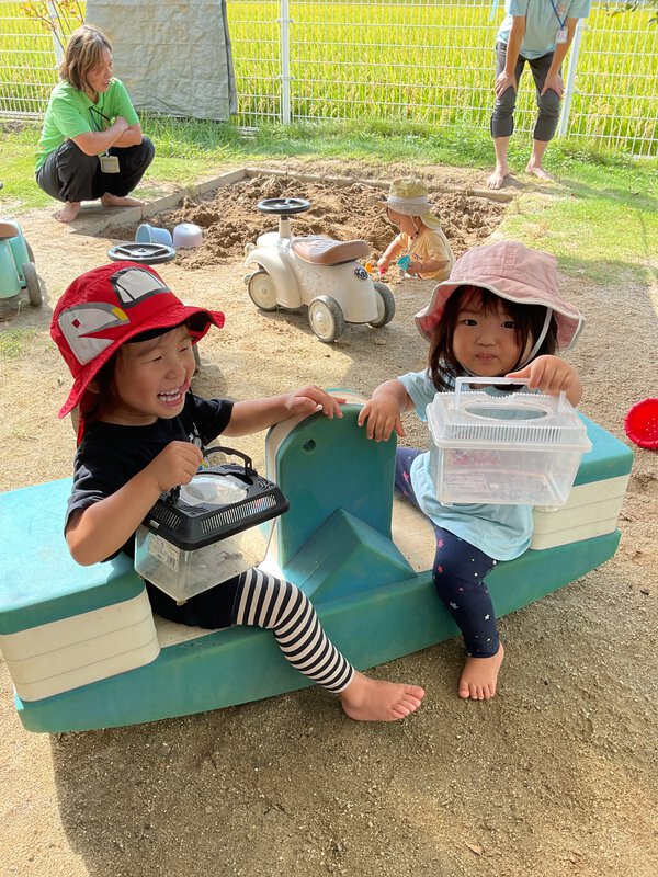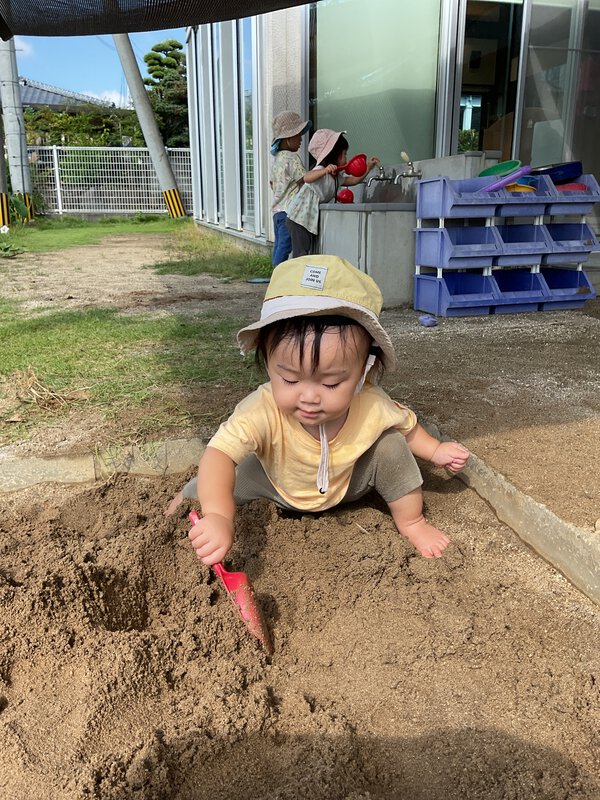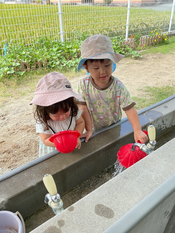 今日は30分間戸外遊びをしました。先生と一緒に虫探しをしました。コオロギとカエルをたくさん捕まえていました。虫かごに入れて、お友達に「みて!」とコオロギとカエルを見せていました。砂場で遊ぶお友達や、水道で水遊びをして、水に濡れるのを楽しんでいるお友達もいました😊