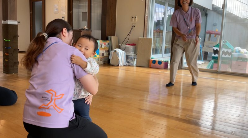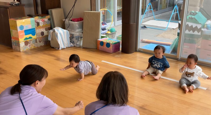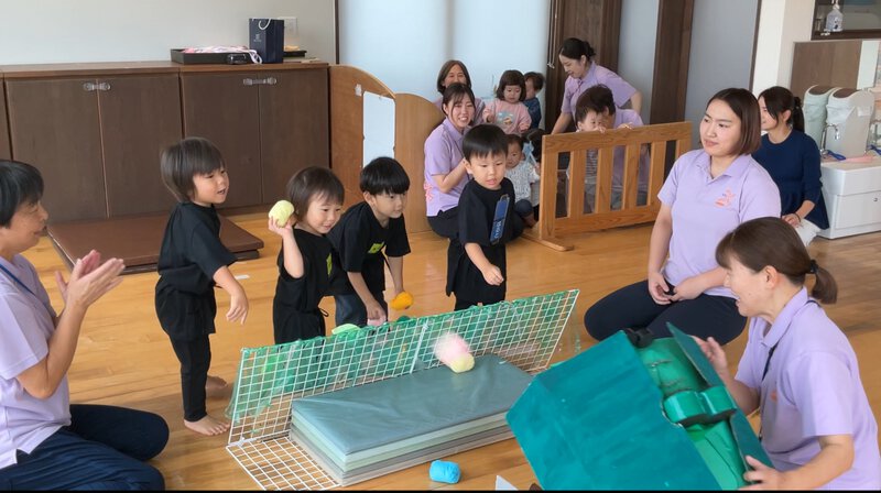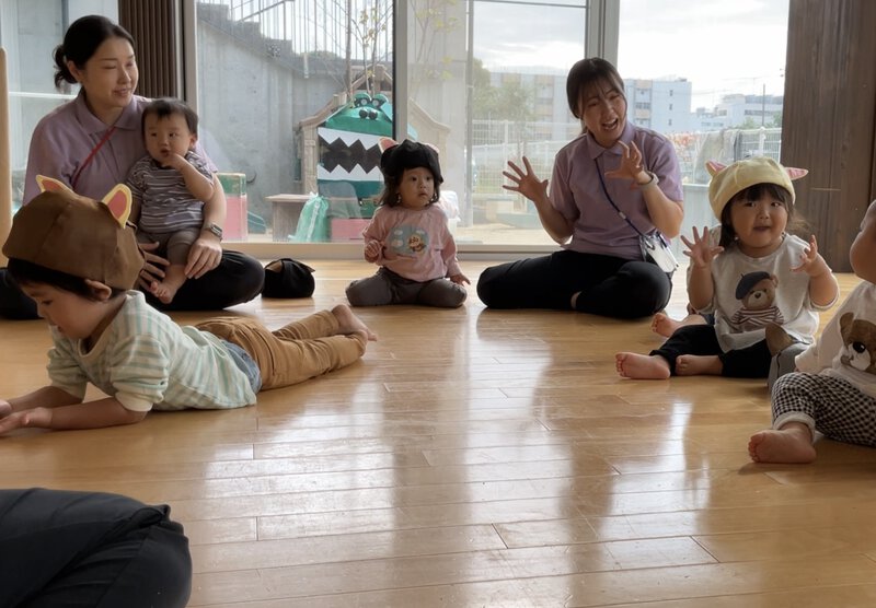 2歳児さんは忍者になりきって競技に参加しましたよ!0、1歳児さんは猫の帽子を被りにゃんころたいそうを踊りました!かけっこや技巧走などでは大好きな先生に向かって走っていた子ども達です♪