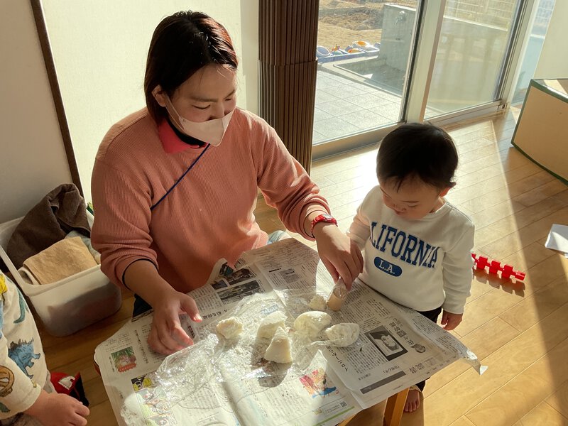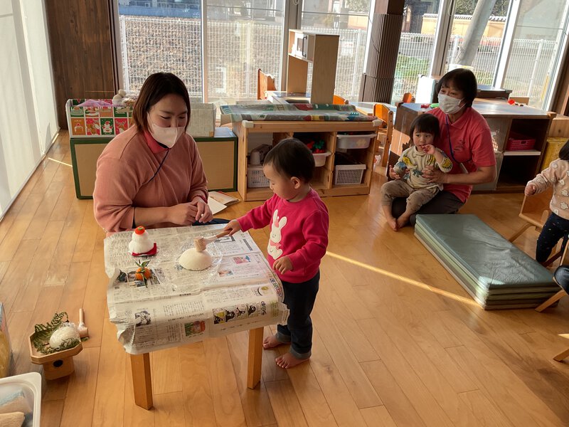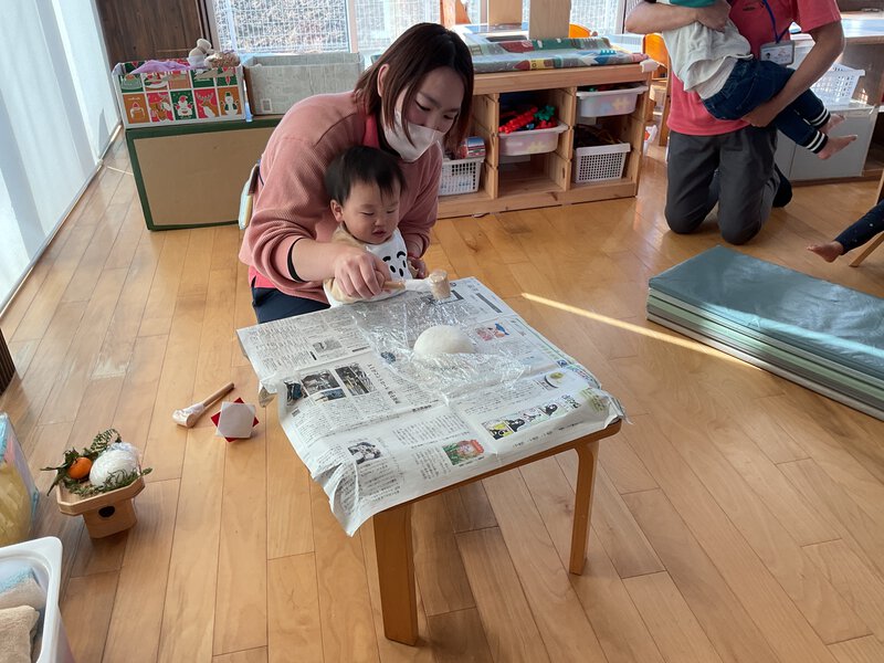 今日は鏡開きを行いました。なぜ鏡開きをするのかをしっかり聞いてから、木づちを持って割る体験をすると子ども達は嬉しそうに順番を待っていましたよ。順番も意識しながらお話を聞けるようになっていて成長を感じます✨割れたお餅もじっと観察していて、お餅を手に取りいろんな角度から見ていました!今年も元気いっぱい、笑顔で過ごしていきたいですね♪